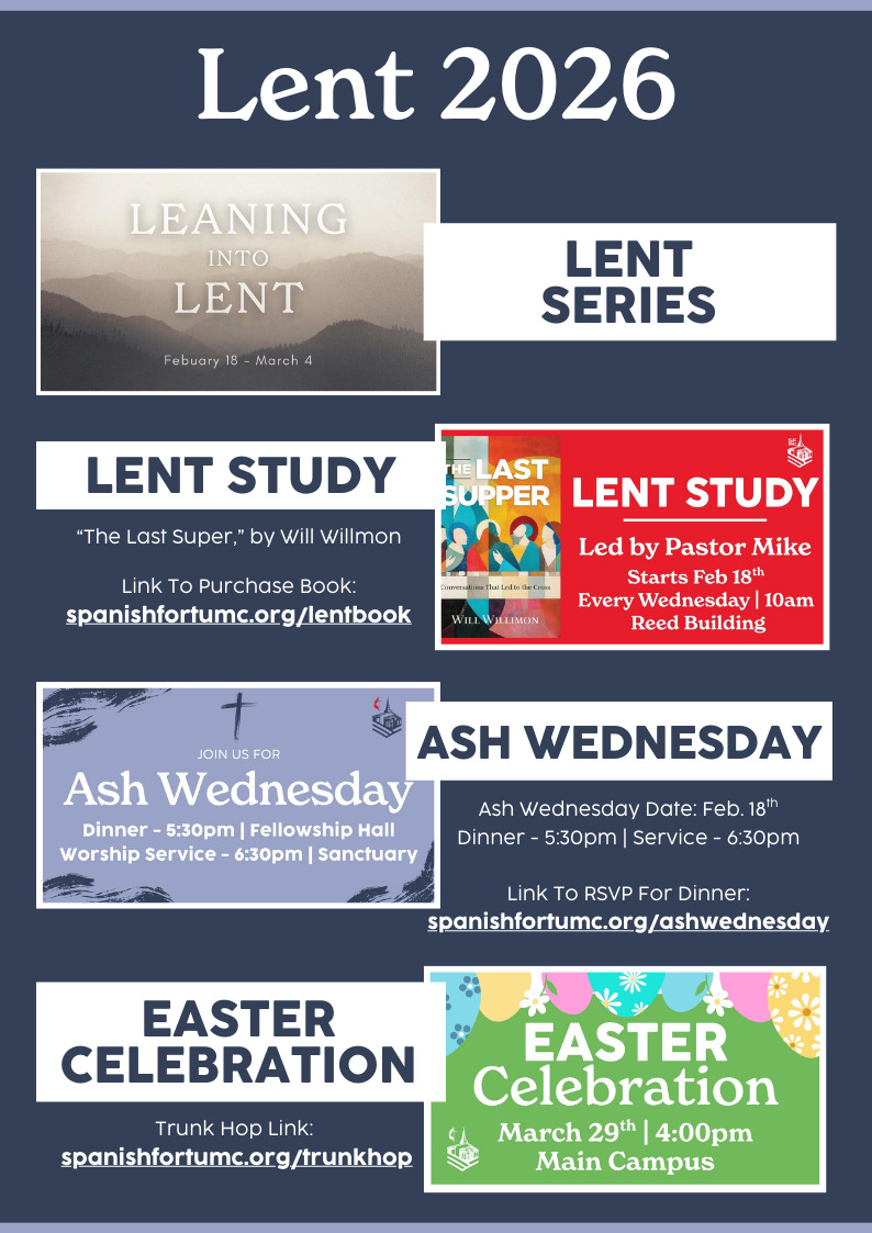 Our Easter Celebration is March 29 at 4:00 p.m. on our Main Campus! We’ll be bringing back our annual Trunk Hop and introducing a new event, a silent auction. More details about the silent auction are coming soon. To sign up to decorate your trunk for the Trunk Hop, please visit spanishfortumc.org/trunkhop.